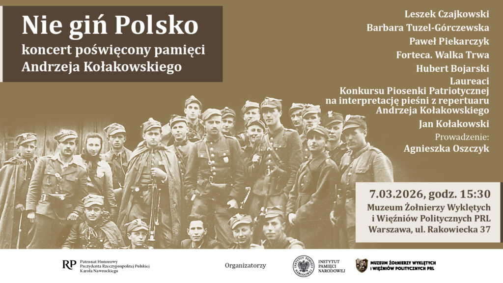 „Nie giń Polsko” to koncert, którym chcemy upamiętnić zmarłego w 2025 r. barda Andrzeja Kołakowskiego. W swoim repertuarze miał wiele pieśni patriotycznych – utworów o powstaniu styczniowym, pieśni odwołujących się do odzyskanej niepodległości, wojny polsko-bolszewickiej, tragicznych wydarzeń II wojny światowej a także oporu przeciw komunistycznej władzy.